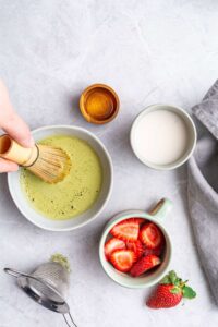 Overall, the strawberry matcha latte tastes best when it’s fresh. However, you can prepare the strawberry and honey mix ahead of time and keep it in the fridge for up to a day. Keep the matcha powder separate and unmixed until you’re ready to assemble the drink. Then pour it over ice or frozen strawberries.
