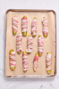 Place the bacon-wrapped pickles on a baking sheet lined with parchment paper. Bake in the preheated oven for 20 minutes or until the bacon is crispy.