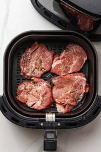 Place the seasoned pork steaks in the air fryer basket in a single layer.