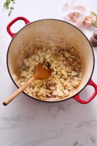 Remove the roast and add onions and garlic to the pot. Cook until onions are translucent, about 5 minutes.