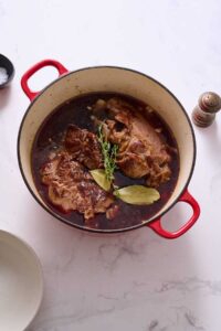 Return the roast to the pot. Add red wine, beef broth, bay leaves, and thyme. Bring to a boil, then cover and transfer to a preheated oven. Cook for 3 hours.