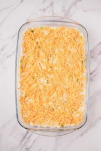 Transfer the mixture to a 9×13 inch baking dish. Sprinkle shredded cheddar cheese evenly over the top. Bake in the preheated oven for 30 minutes or until the cheese is bubbly and golden.