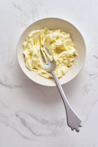 In a bowl, mash the softened unsalted butter with a fork until smooth.