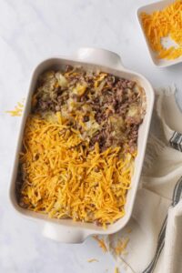 This no-egg breakfast casserole is a perfect example of a simple yet delicious brunch dish that never lasts long on the table. With hearty ground beef, convenient frozen hash browns, and plenty of gooey cheddar, it’s always the talk of these get-togethers. Skipping the eggs not only makes it a great option for those with allergies, but it’s also a lifesaver during egg shortages or when egg prices skyrocket. Making it couldn’t be easier, either. The only thing you have to chop is an onion. Everything else is ready to go. I’ve even been known to serve it for dinner. All it needs is a crisp, green salad on the side and perhaps a good glass of wine.