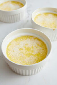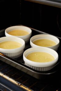 Pour the mixture into the ramekins. Add boiling water to the baking dish until it reaches halfway up the sides of the ramekins. Bake for 30-40 minutes until the custards are set but still slightly jiggly in the center.