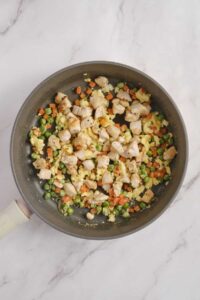 Add the cooked chicken back into the pan. Add the cooked rice. Pour in the soy sauce and sesame oil. Stir everything together and cook for 2–3 minutes until well combined and heated through.