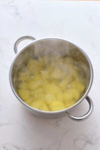 Place cubed potatoes in a pot, cover with water, and bring to a boil. Add salt, reduce heat, and simmer until tender, about 9-12 minutes. Drain well.