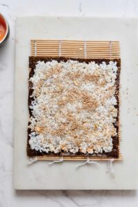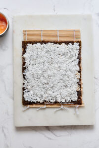 Wet your hands and spread about 1/2 cup of sushi rice evenly over the nori.