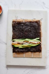 Flip the nori so the rice is facing down. Place cucumber, avocado, and shredded imitation crab near the bottom edge of the nori.