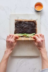 Lift the edge of the mat over the fillings, squeezing gently but tightly to form a roll. Continue rolling until the sushi is fully enclosed, using the mat to maintain the roll’s shape.