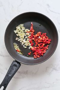 Heat olive oil in a nonstick skillet over medium heat. Add the diced onion and bell pepper, and sauté for 3-5 minutes until softened.