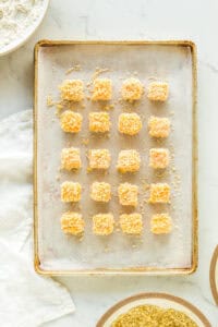 Yes! To prep your fried cheese ahead of time, follow steps one through three and then move the frozen, uncooked cheese chunks to a freezer-safe container. Store in the freezer until you’re ready to fry them!