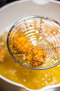If you’re new to deep-frying foods yourself, this can be a fun way to learn. Although the oil usually stays in the pot, I suggest wearing an apron and gloves to protect your clothes and skin from stray splatters, just in case.