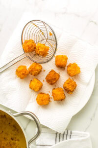 Don’t let the “fried” aspect frighten you. There’s no need for a fancy deep fryer with this recipe. All you need is a deep pot and four cups of frying oil. Use a mesh ladle or a pair of tongs to remove the fried cheese chunks from the oil, and drain them on paper towels. Ta-da! Enough crispy, cheesy chunks to last the night and then some.
