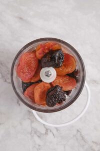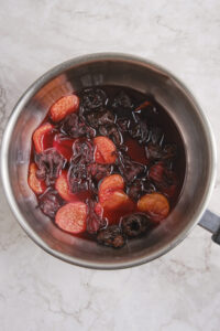 In a saucepan, combine apricots, prunes, hibiscus, water, and sugar.