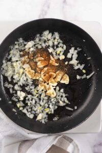 Add the finely chopped onion to the skillet and sauté until softened, about 5 minutes.