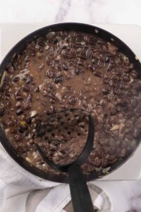 Once cooled, refrigerate your refried black beans in an airtight container for up to 5 days. You may also freeze them for up to 3 months, taking care to thaw them in the fridge overnight before serving. Warm them up in a pot on the stove over medium heat, stirring occasionally, until they begin to simmer. If they seem too thick or sticky, add a splash of water or broth and stir again until it matches your preferred consistency.