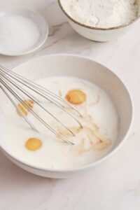 Blend eggs, milk, flour, sugar, vanilla, and salt until smooth. Let batter rest for 10 minutes.