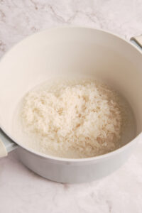 To rinse your rice, you can use a sieve or do it in the pot you’ll cook the rice in. Simply run water over the rice—using your hands if needed to swirl the water and make sure it runs over all the grains evenly—until the water runs clear. Be sure to drain the cloudy water from the pot before filling it with fresh water for cooking. This will ensure every grain stays separate, and you’ll be left with perfect, fluffy rice.