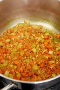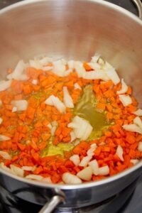 In a large pot, heat the olive oil over medium heat. Add the chopped onion and diced carrots. Cook, stirring occasionally, until the vegetables are softened, about 5 minutes.