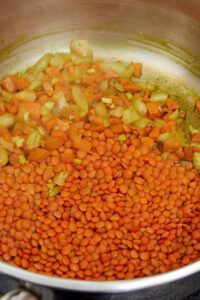 Stir in the rinsed red lentils, vegetable broth, and diced tomatoes with their juices. Season with salt and black pepper to taste. Bring the mixture to a boil.