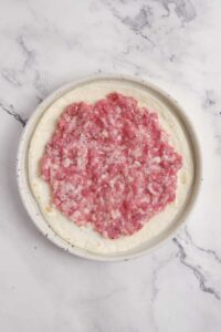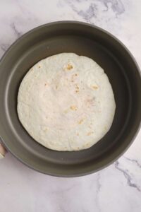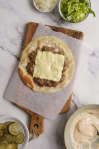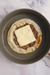 Press raw ground beef gently into the tortillas to form a uniform and even layer, then add the tortilla to the pan beef-side down. This will help cook the beef quickly and efficiently before flipping the tortilla. Once you flip it, top it with cheese immediately. You are free to use any type of cheese you prefer; cheddar can work just as well as American cheese, although I’ve found that Colby Jack melts more quickly, which helps you finish cooking sooner.