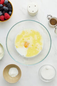 In a separate bowl, whisk together the milk, egg, melted butter, and vanilla extract until well combined.