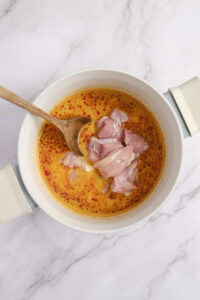 In a pot over medium heat, warm oil. Add red curry paste, turmeric, coriander, cardamom, and curry powder. Cook for 1-2 minutes until fragrant.