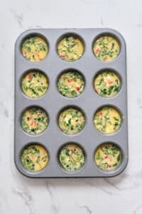 The great thing about these egg bites is that they’re endlessly versatile. You can easily swap the spinach and red pepper for your favorite veggies—or whatever you’ve got in your fridge! Mushrooms, kale, and asparagus, for example, could all be yummy. I also love adding a touch of whatever herb I have on hand for some extra flavor. My personal favorites are dill and parsley. Or you could add a dash of hot paprika or red pepper flakes for a spicy kick.