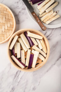 No, you don’t need to peel the eggplant, no matter which of the two Asian varieties you’re using. Steaming helps to tenderize the skins. There’s also no need to soak the eggplant to prevent it from turning brown, so long as you place it directly into the steamer after slicing. If you are not ready to steam the eggplant after cutting it, you will need to soak it in a solution of two cups of water and two tablespoons of an acid, like lemon or lime juice, apple cider vinegar, or another light-colored vinegar.