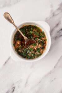 In a bowl, mix together the soy sauce, oyster sauce, sugar, toasted sesame oil, minced garlic, ginger, half of the chopped scallions, and rice vinegar.