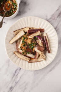 One of my all-time favorite vegetable dishes at Chinese restaurants is steamed eggplant. It’s typically served in a deliciously sweet, tangy, silky sauce with the perfect hint of salt. I’m often torn between this dish and baby bok choy—so I usually end up getting both. I frequently make bok choy at home, but it wasn’t until recently that I started making this eggplant dish regularly, too.