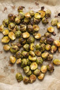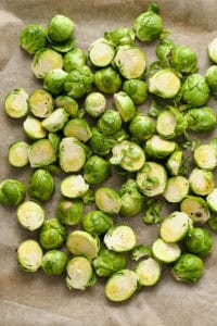 Roast the Brussels sprouts in the oven for about 25-30 minutes, flipping once halfway through, until they are browned and tender.