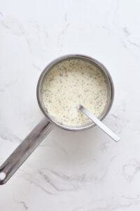 While the sprouts roast, melt butter in a saucepan over medium heat. Stir in flour and cook for 1 minute until golden. Gradually whisk in onion powder, Italian seasoning, milk, and cream.