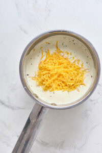 Simmer for 3-4 minutes until the sauce thickens, then stir in 1/2 cup of the cheddar cheese and season with salt and pepper.