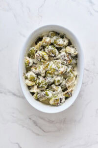 Once cooled to room temperature, Brussels sprouts casserole can be stored in an airtight container or covered with aluminum foil. Refrigerate it like this for up to 3 days. For longer storage, transfer it to a freezer-safe container and freeze for up to 3 months. Make sure to thaw it in the fridge overnight before reheating, and then place it back into an oven-safe dish. Bake in the oven at 350°F for 15-20 minutes, until it’s completely warm. Note that freezing and thawing can make the sprouts mushy, but they should still taste great.