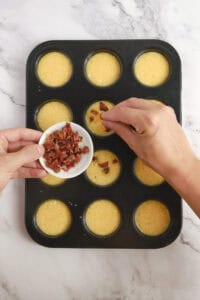 Sprinkle chopped bacon on each cup, gently pressing it into the egg mixture.
