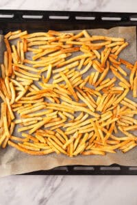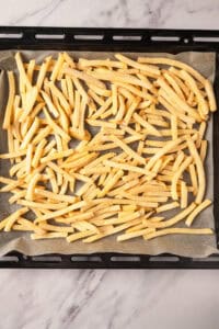 Line a rimmed baking sheet with parchment paper. Spread the frozen fries in a single layer, then season with seasoned salt, tossing to coat.