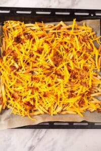 Absolutely! This recipe is more of a ‘guideline,’ if you will, but cheese fries come in all shapes and sizes—really! For a ‘fair-style version,’ switch out the shredded sharp cheddar for a nacho cheese sauce. Looking to make things a little funky? Top your plate off with some chunks of blue cheese and a spoonful of caramelized onions that’ll have you feeling oh-so-fantastic. And adding a protein like grilled chicken, pulled pork, or even birria can easily make this bar snack a fulfilling and flavorful meal.