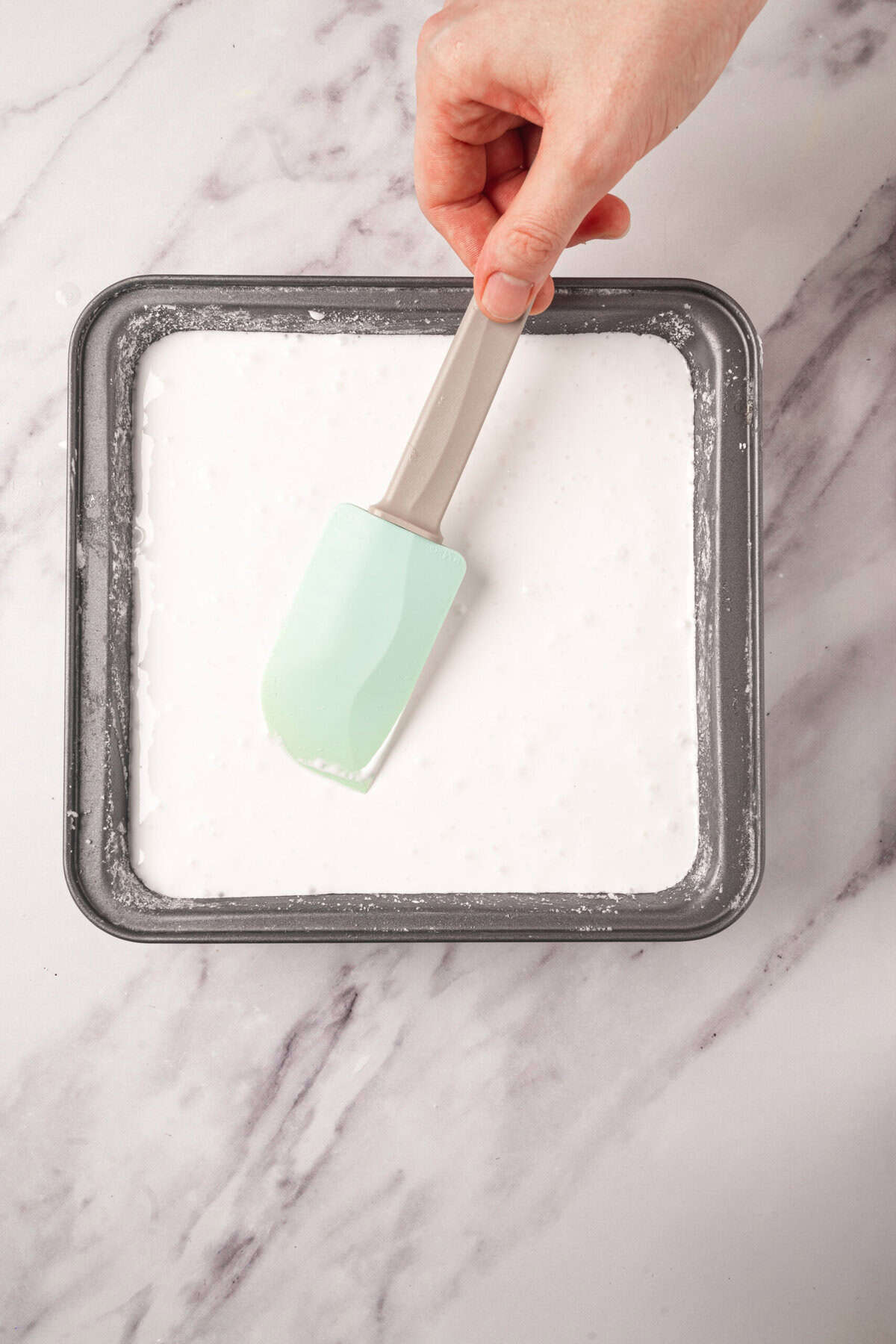 Grease a 9-inch square baking pan with nonstick spray or a thin layer of oil. For extra ease when removing the marshmallows, dust the pan with a mix of sifted confectioners’ sugar and cornstarch.