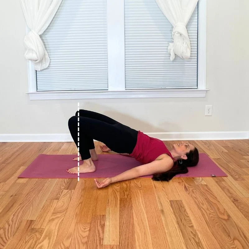 But in the rehab world, bridge pose is often practiced with the feet slightly forward of the knees, which results in a shin that angles forward a bit and a knee flexion angle around 90°.