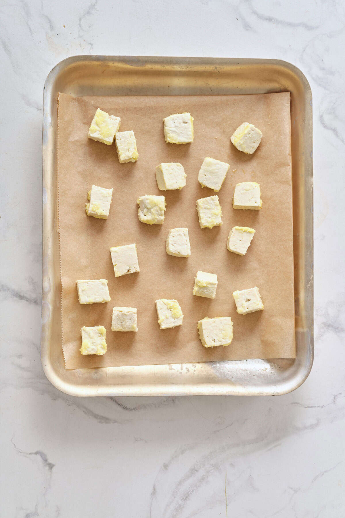 Press the tofu for at least 15 minutes to remove excess water. Preheat your oven to 400°F. Cut the pressed tofu into 1-inch cubes.