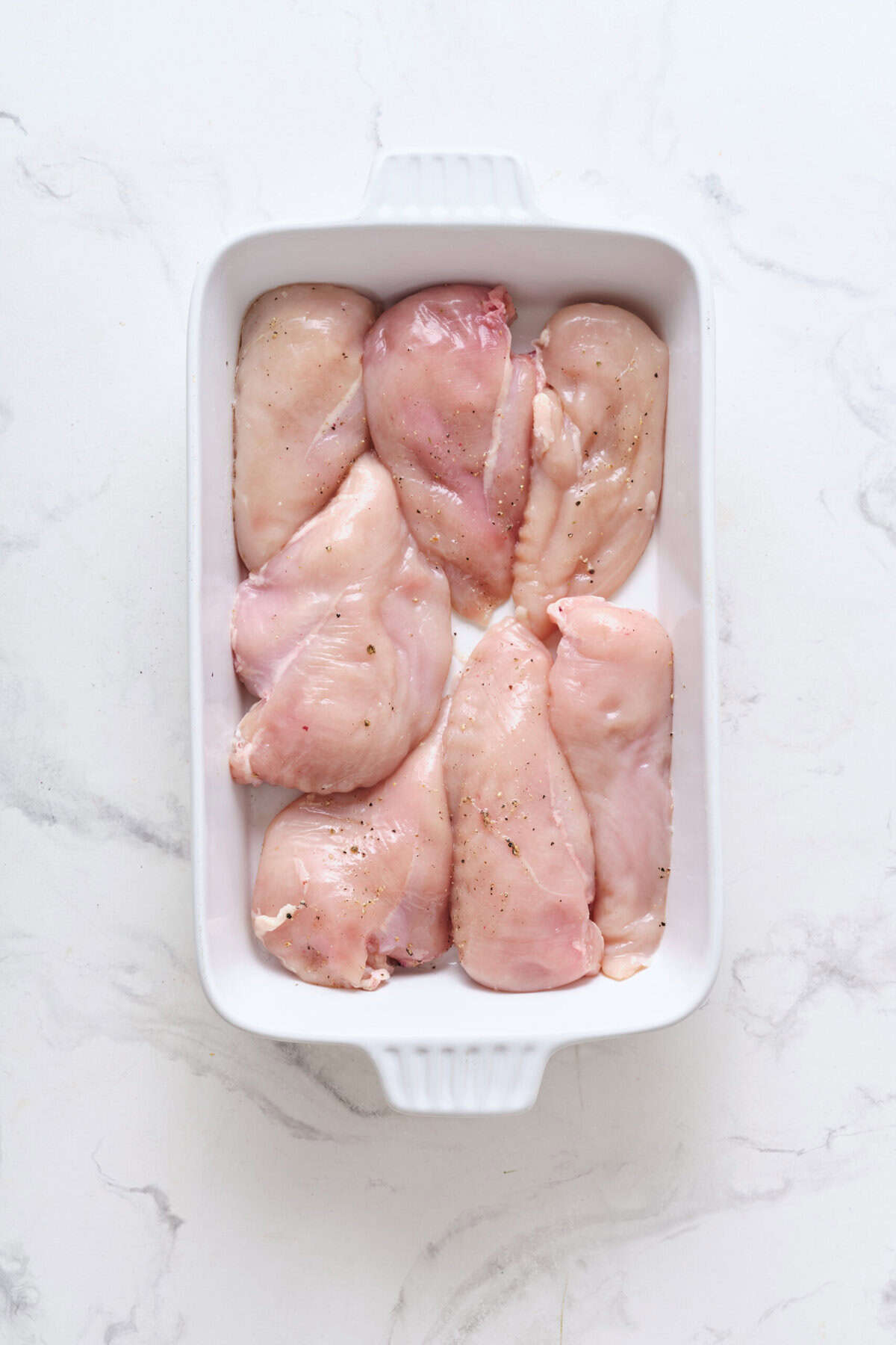Season the chicken breasts with salt and pepper, then arrange them in a single layer in a greased 9×13-inch baking dish.