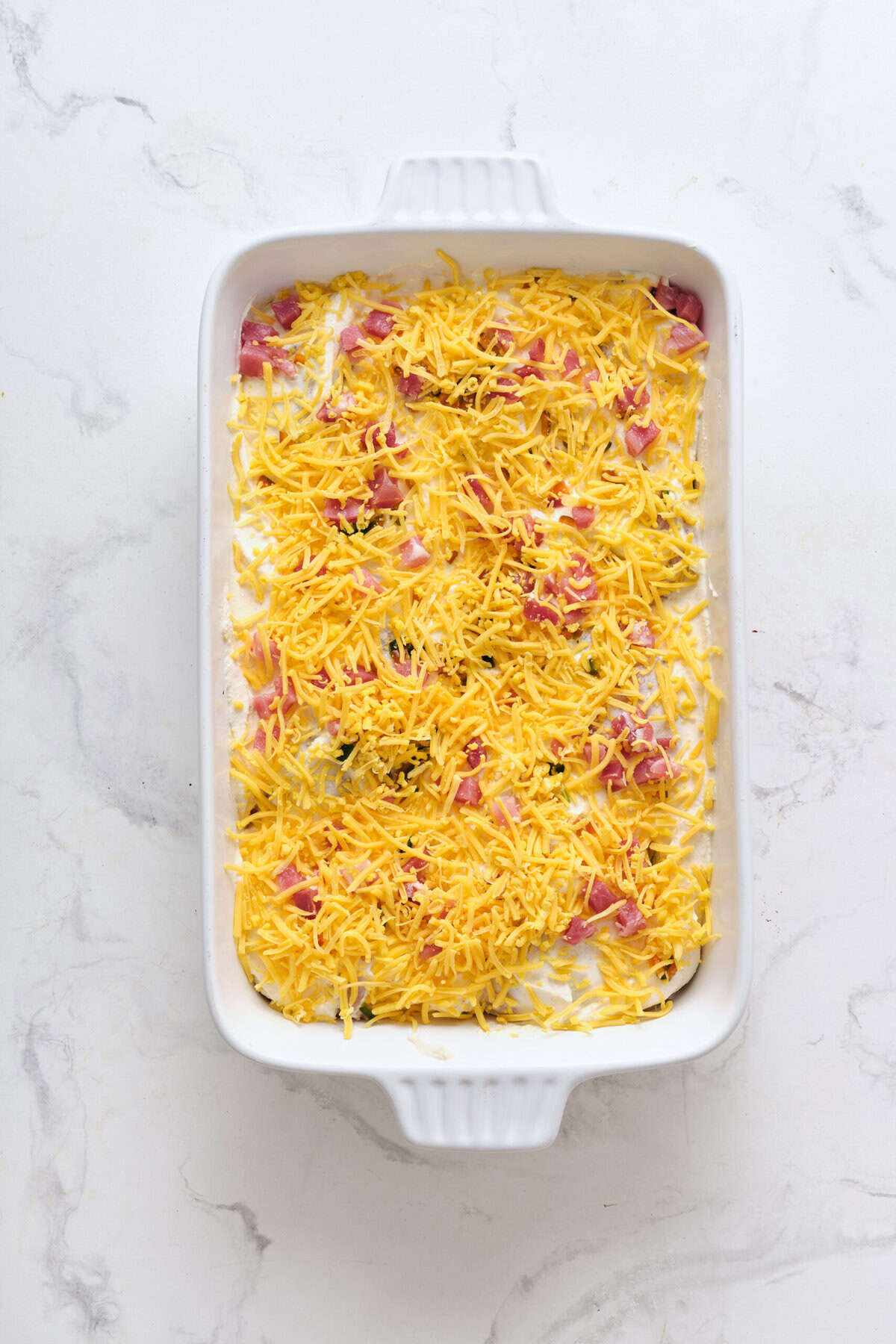 Sprinkle the diced jalapeños, crumbled bacon, and shredded cheddar cheese on top.