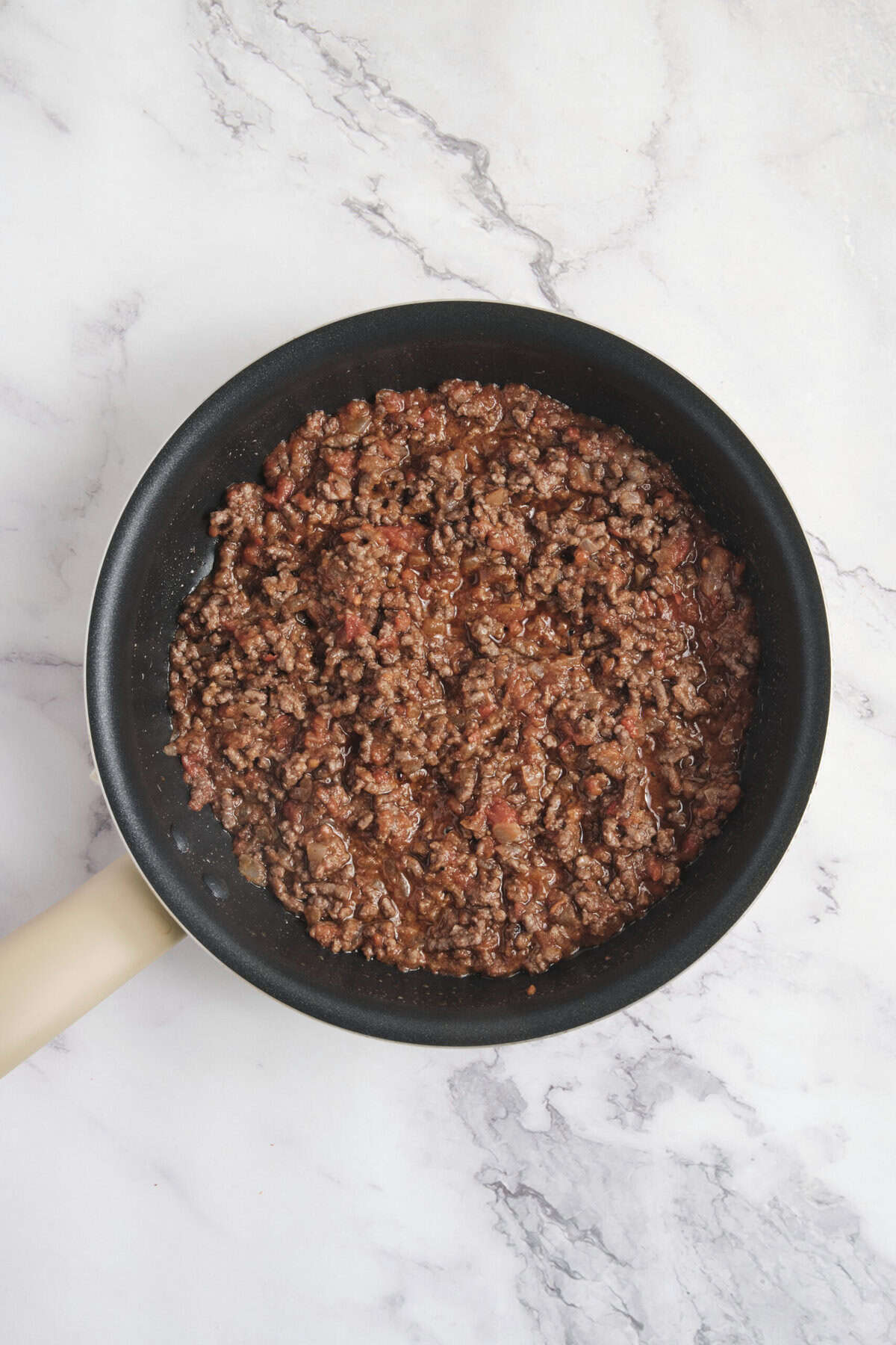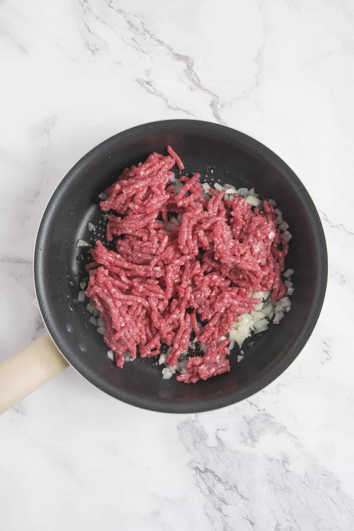 Drizzle a small amount of olive oil in a nonstick skillet and sauté the diced onion over medium heat until soft. Add the lean ground beef and break it apart as it browns.
