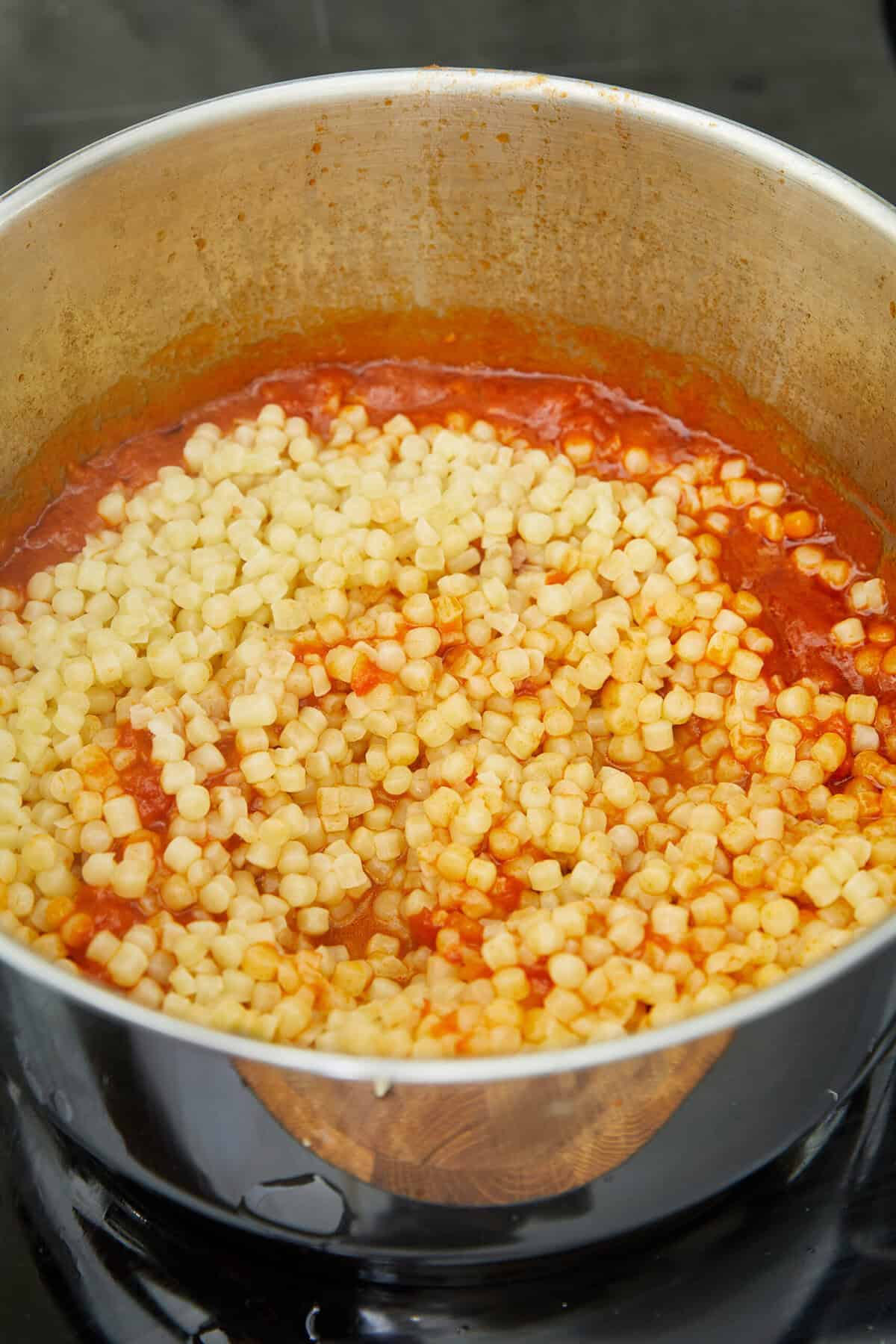 In a separate pot full of salted boiling water, cook the fregola sarda pasta until it is al dente. Drain and add it to the sauce.