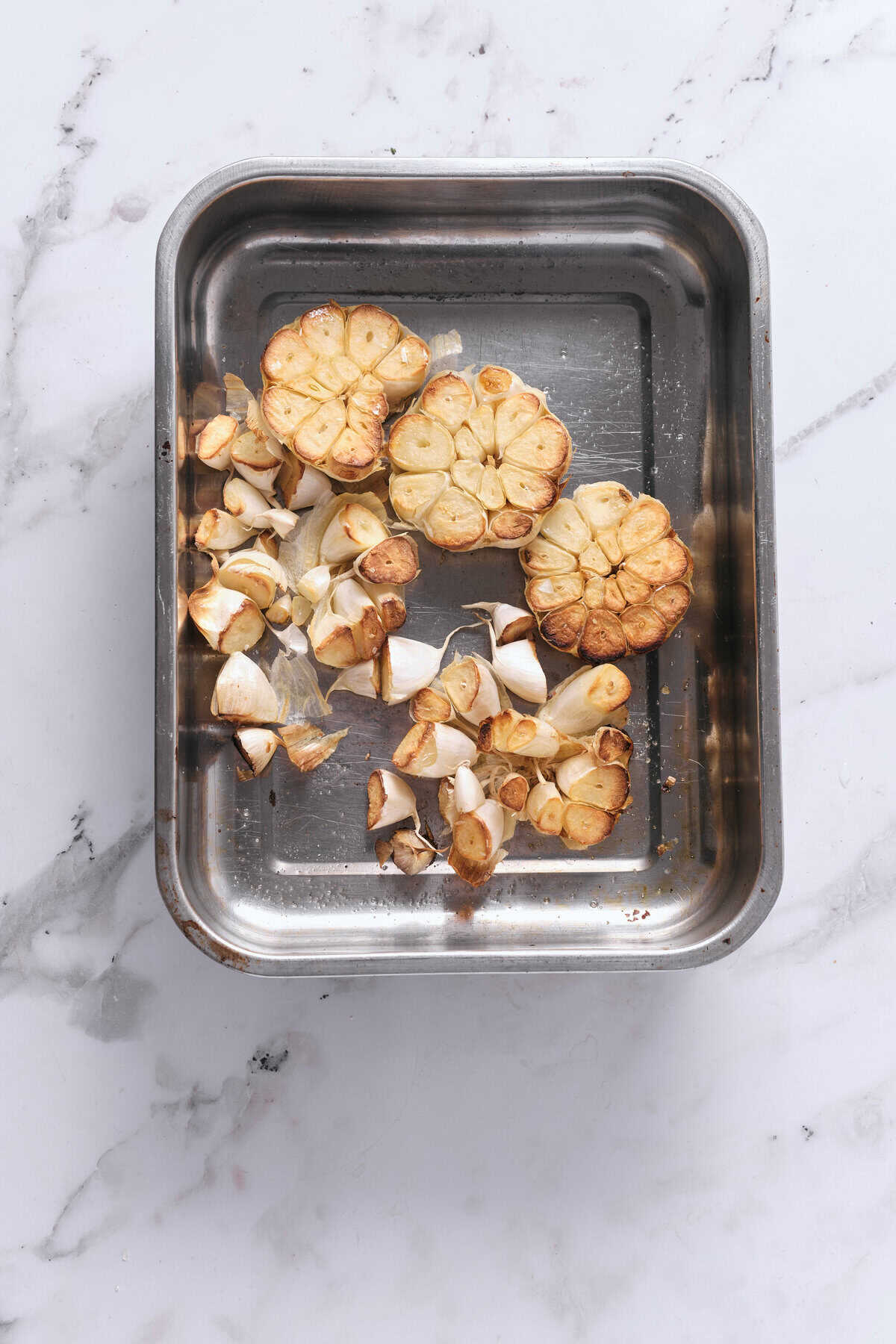 Preheat your oven to 400°F. Cut the tops off the garlic heads or slice them in half horizontally. Place the garlic halves in a small baking dish, drizzle with 1 tablespoon olive oil and a pinch of salt, then roast for about 15 minutes until the cloves are soft. Once done, let them cool and squeeze the roasted cloves out of their skins.