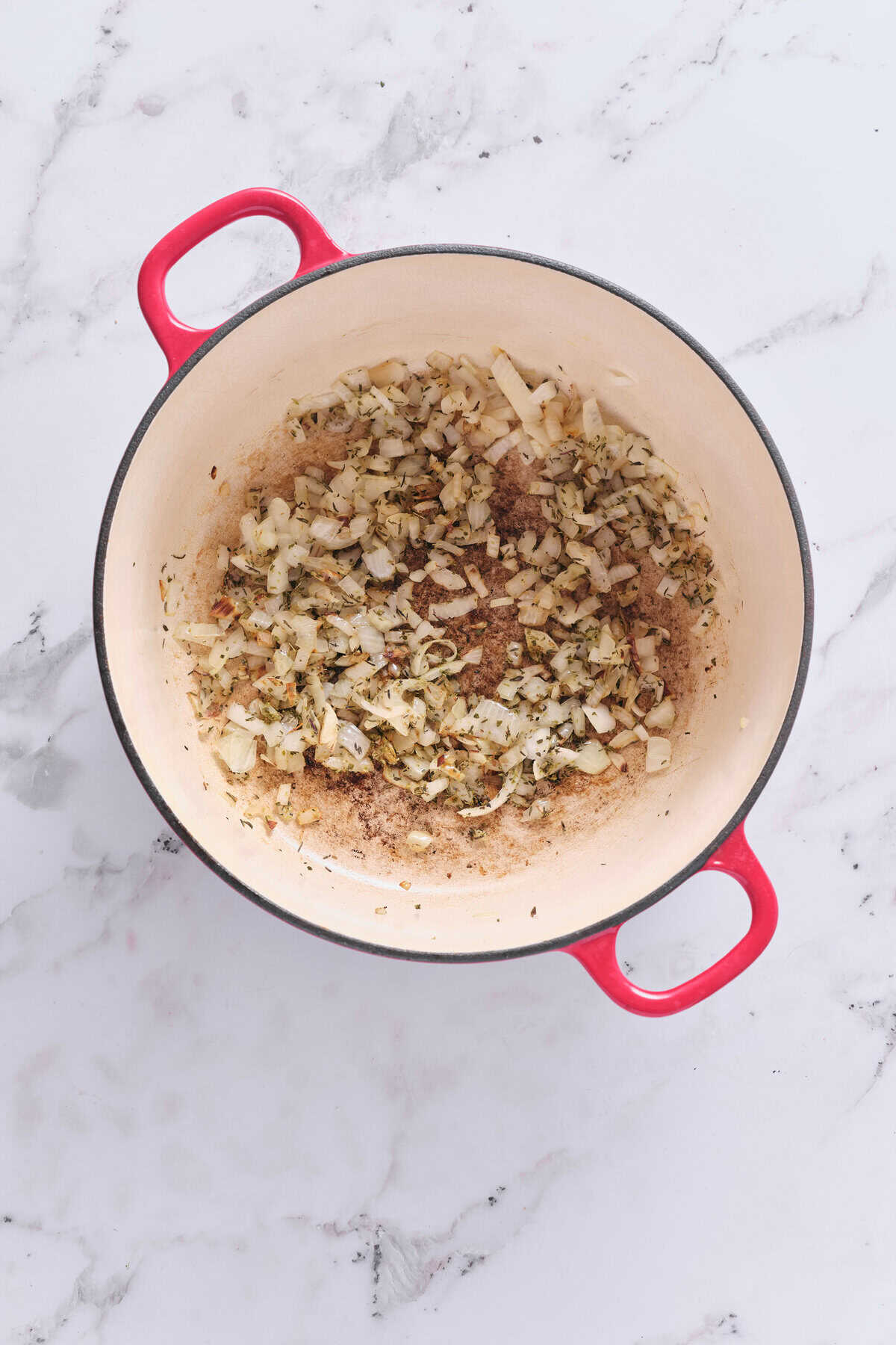 While the garlic roasts, heat the remaining olive oil in a large pot over medium heat. Add the chopped onion, oregano, and thyme, and sauté for about 5 minutes until it becomes translucent.