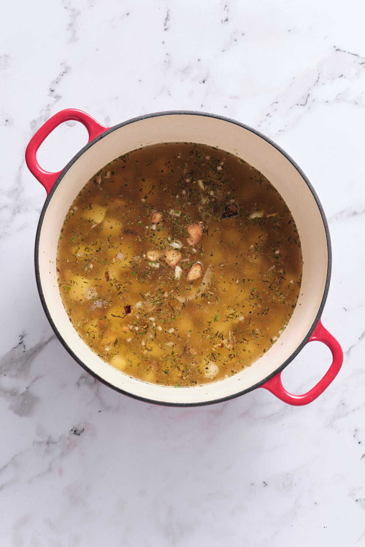 Add the cubed potato to the pot along with the squeezed roasted garlic. Pour in the broth and season with salt and black pepper. Bring the mixture to a simmer and let it cook for about 15-20 minutes, or until the potato is tender.