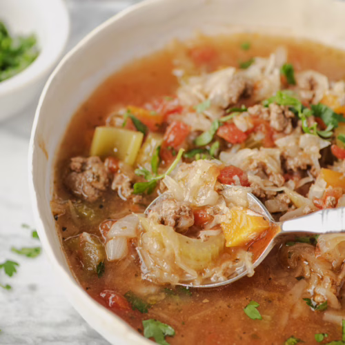 To create a meat-free version of this soup, skip the ground beef and swap the beef broth with vegetable broth. You can also use ground chicken and chicken broth rather than beef.